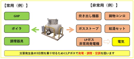 普段使いしながら災害対応を実現! 災害対応型のLPガス供給システムで災害時にも発電機や炊出器具等へのガス供給を可能にします。